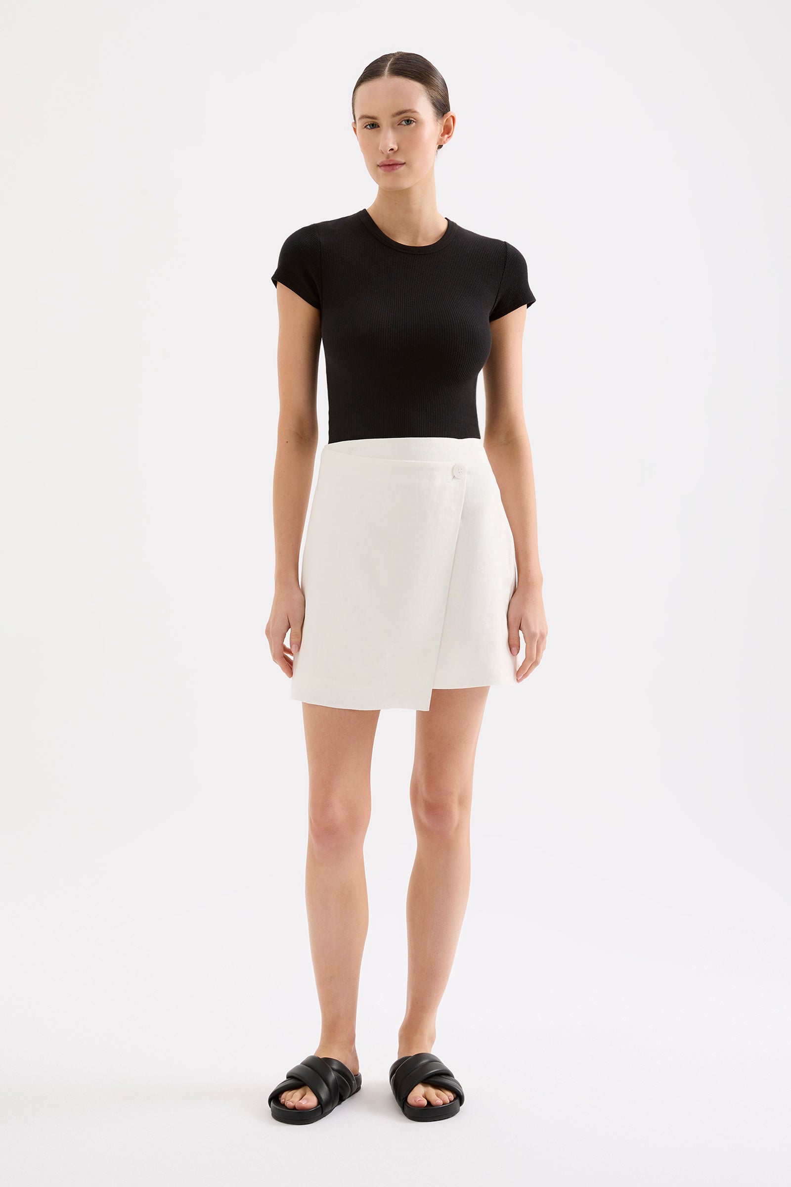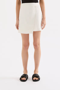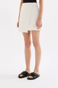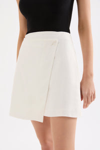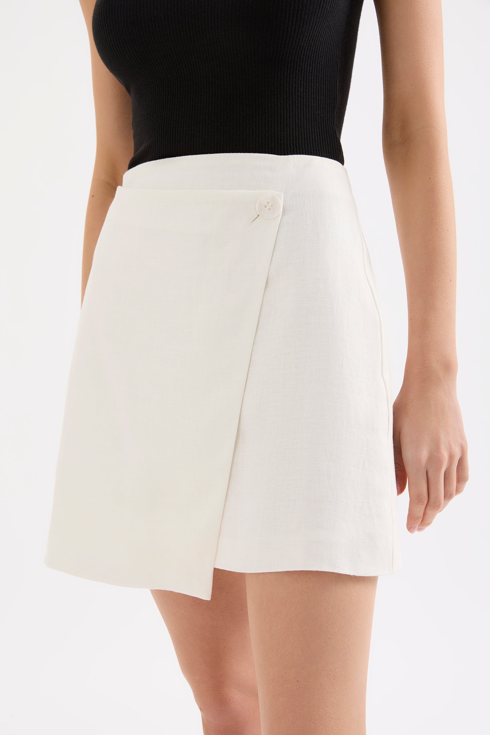 The Thilda Linen Mini Skirt in white is made from 100% linen which has been washed for a soft, breathable hand feel. The silhouette is high waisted and mini in length. Features include mock wrap front panel, mock shell button and invisible zipper at back. This skirt is fully lined.
