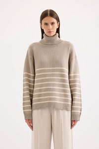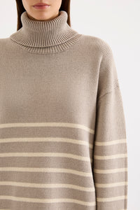 The Venus Turtleneck is made from a cotton blend yarn with a soft hand feel. The silhouette is relaxed with a dropped shoulder, and length finishing below the hips. Features include fold over turtleneck, placement stripe design, ribbed collar, cuff and hem.