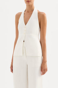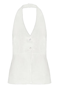 The Zayda Linen Vest is made from 100% Linen which has been washed for a soft, breathable hand feel. The halter neck silhouette is tailored to fit close to the body and finishes below the hips. Features include a halter neck v neckline, open back and button opening at front. This vest is fully lined.